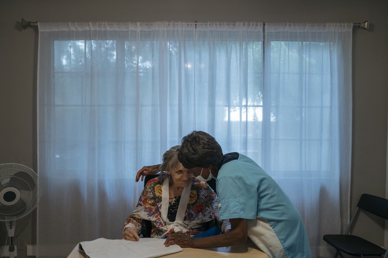 Ann and Mary, a caregiver, embrace at the group home where Ann resides in Hawthorne, California.